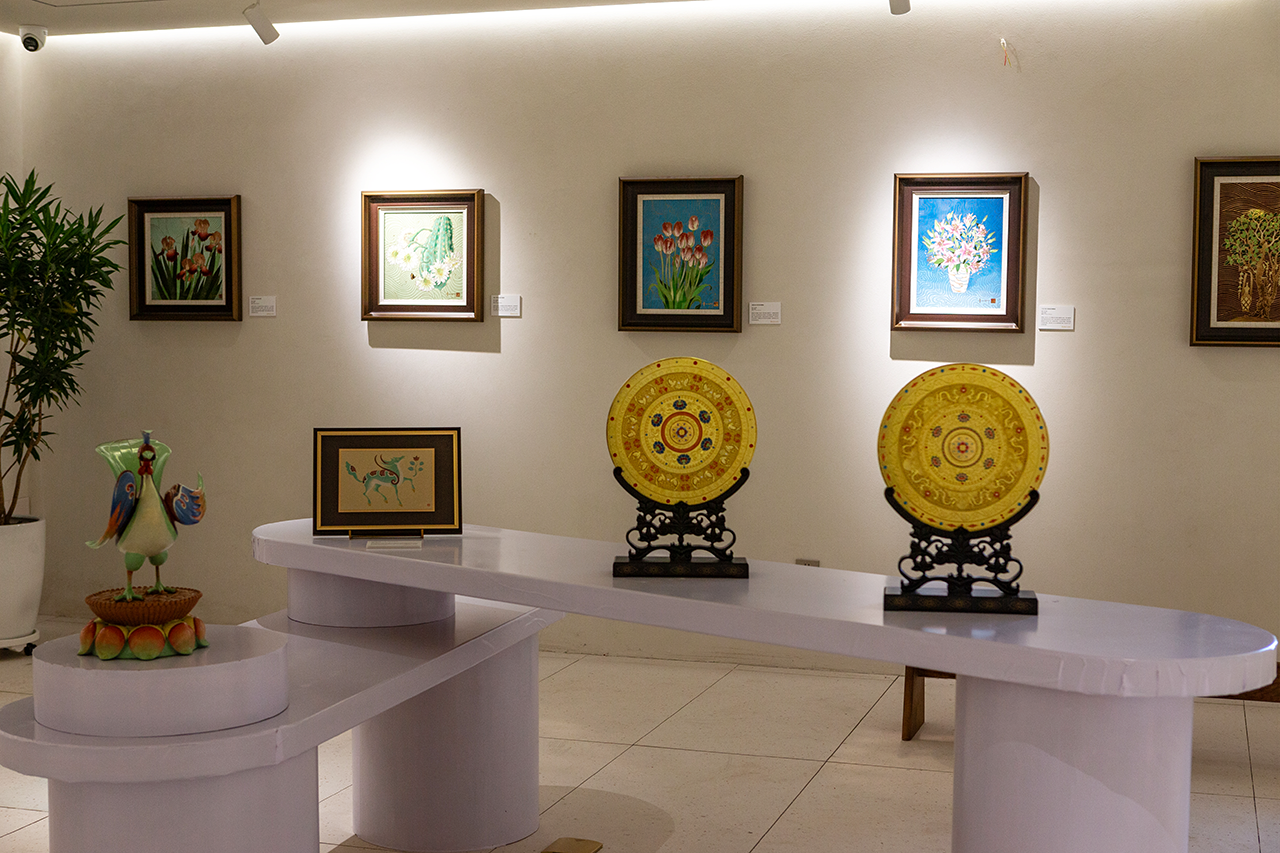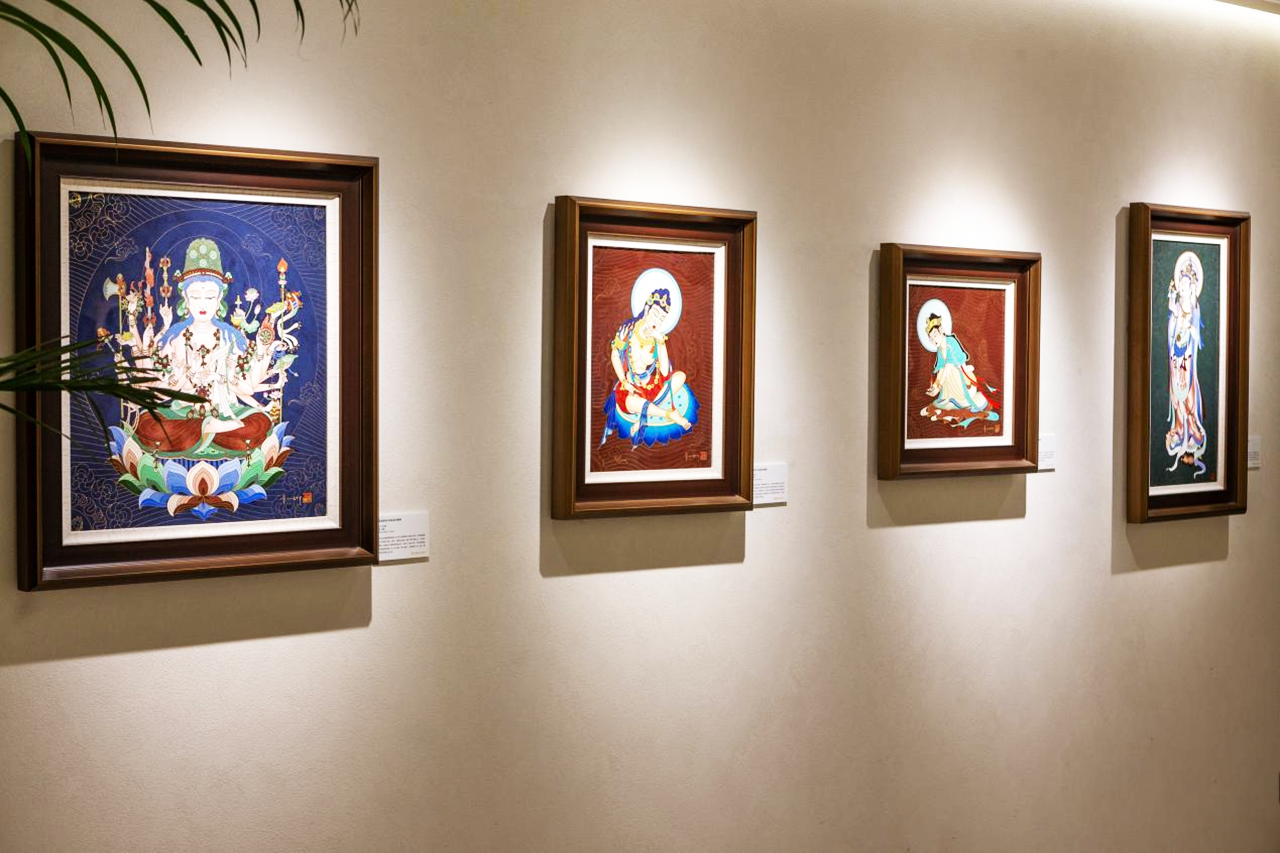 常沙娜艺术中心的展品丰富多样,共展出景泰蓝珍藏画、金丝琅彩画、数码版画、丝巾、瓷器、珠宝、收藏卡牌、动物雕塑、公仔雕塑等9大类、100余件产品,涵盖了从艺术创作到文创产品的多个领域,实现了敦煌艺术研究传承与多元当代艺术表达的有机结合。中心的设立,不仅是对常书鸿、常沙娜两代艺术大家文化坚守的致敬,更是敦煌美学与现代创意设计、文化教育、产业拓展深度融合的重要体现。